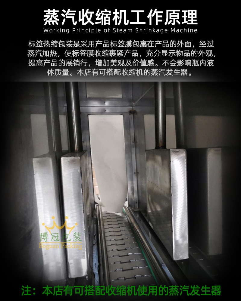 - 瓶裝產品包裝:對于洗發水、沐浴露等瓶裝日化產品,蒸汽收縮機可以將瓶身包裹在透明的 PVC 或 POF 薄膜中。通過精確的蒸汽控制,使薄膜緊密貼合瓶身,不僅可以起到保護產品的作用,還能提升產品的外觀檔次。同時,收縮包裝還可以防止瓶身標簽被刮擦,保持產品信息的完整性。