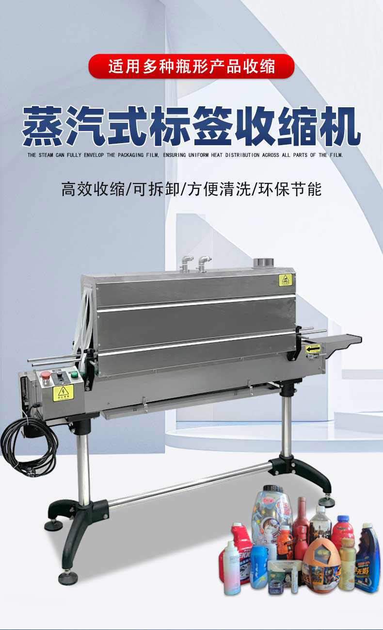 - 適配不同形狀產(chǎn)品:對(duì)于圓瓶類的飲料瓶、香水瓶,蒸汽可無(wú)死角環(huán)繞瓶身,讓收縮膜從頂部到底部勻速收縮,貼合瓶身曲線且無(wú)褶皺;針對(duì)方瓶類的化妝品禮盒、醬料瓶,蒸汽能均勻滲透到平面與棱角,收縮膜精準(zhǔn)嵌入邊角,使包裝方正挺括;就算是扁瓶類的酒壺、扁狀洗手液瓶,蒸汽也能適應(yīng)其特殊輪廓,讓收縮膜完美貼合,凸顯產(chǎn)品造型。