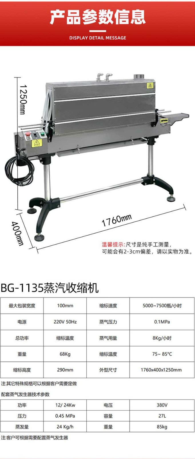 以東莞博冠包裝實(shí)業(yè)有限公司的 1135 型小型蒸汽收縮機(jī)為例,其功率為 12kW,電壓為 380V,蒸汽壓力為 0.08MPa,外形尺寸為 1700mm×900mm×1250mm,輸送帶寬度為 110mm。
