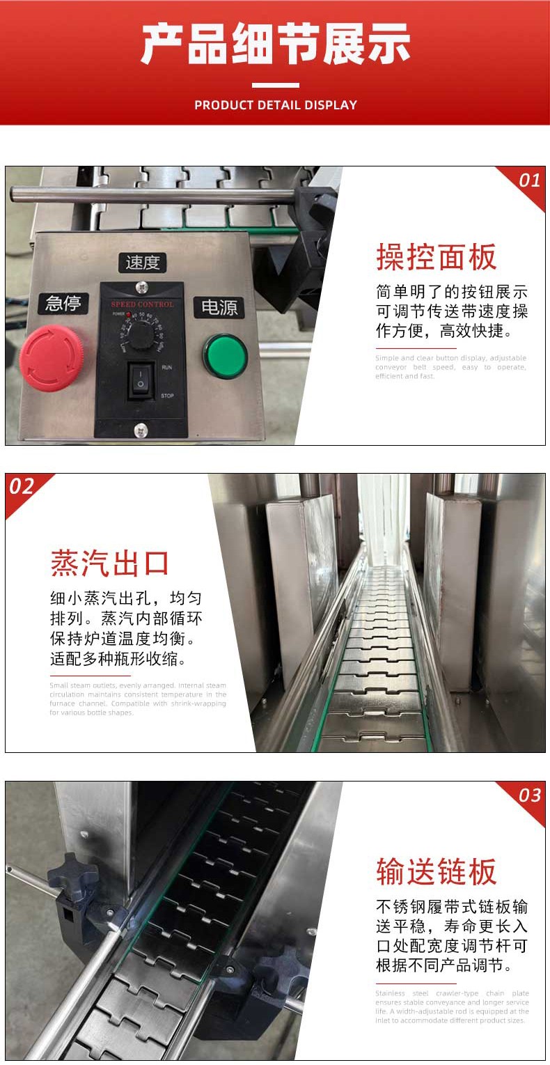 - 收縮通道:內(nèi)部設(shè)有蒸汽噴射孔或噴嘴,通道長(zhǎng)度與寬度根據(jù)產(chǎn)品尺寸可調(diào),確保蒸汽均勻覆蓋。