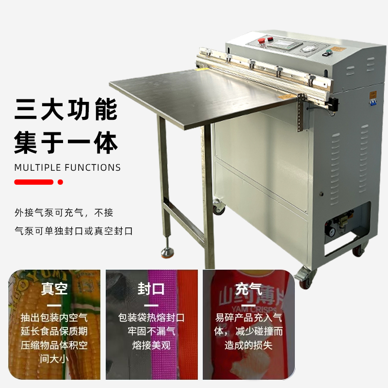 - 支持真空包裝 + 充氣兩用,可充入氮氣、二氧化碳等惰性氣體,適用于易碎、易氧化、需防擠壓的產品(如膨化食品、精密儀器)。