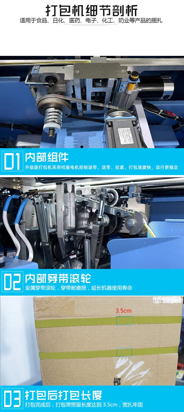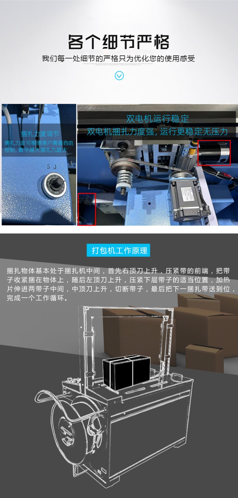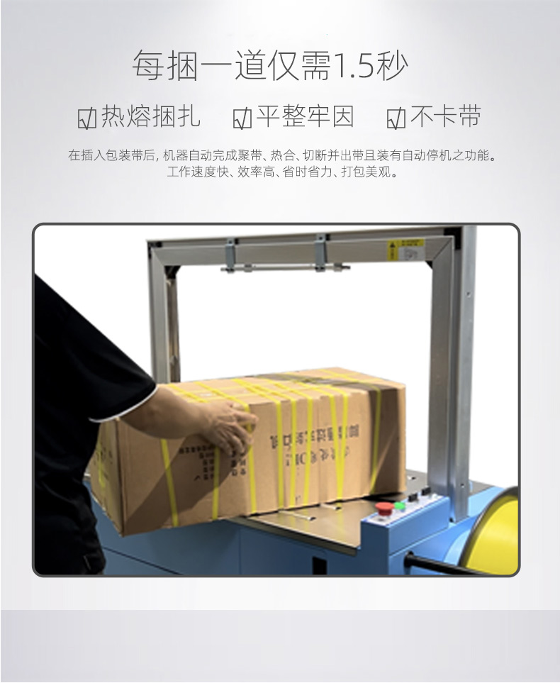 - 伺服電機可按需調(diào)節(jié)送帶長度,避免多余耗材浪費,同時精準控制熔接溫度和時間,打包帶接頭牢固度高,減少因接頭斷裂導致的重復打包,能降低 10% - 15% 的打包帶損耗。