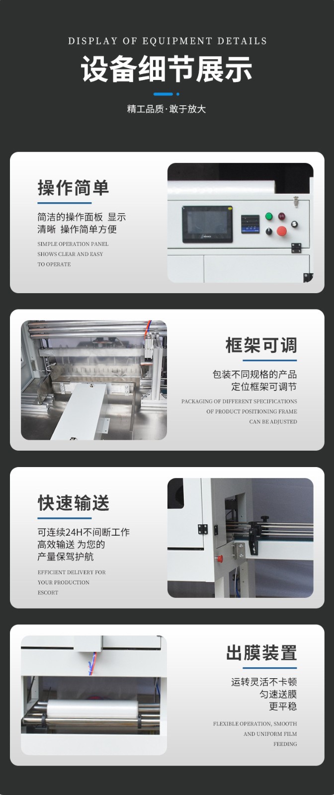 - 連續穩定工作能力:可以長時間不間斷地運行,設備的關鍵部件經過精心設計和嚴格測試,具有良好的耐用性和穩定性。在連續工作過程中,包裝速度和質量不會出現明顯波動,這對于應對生產旺季或大量訂單的情況非常有利,能夠確保按時完成生產任務。